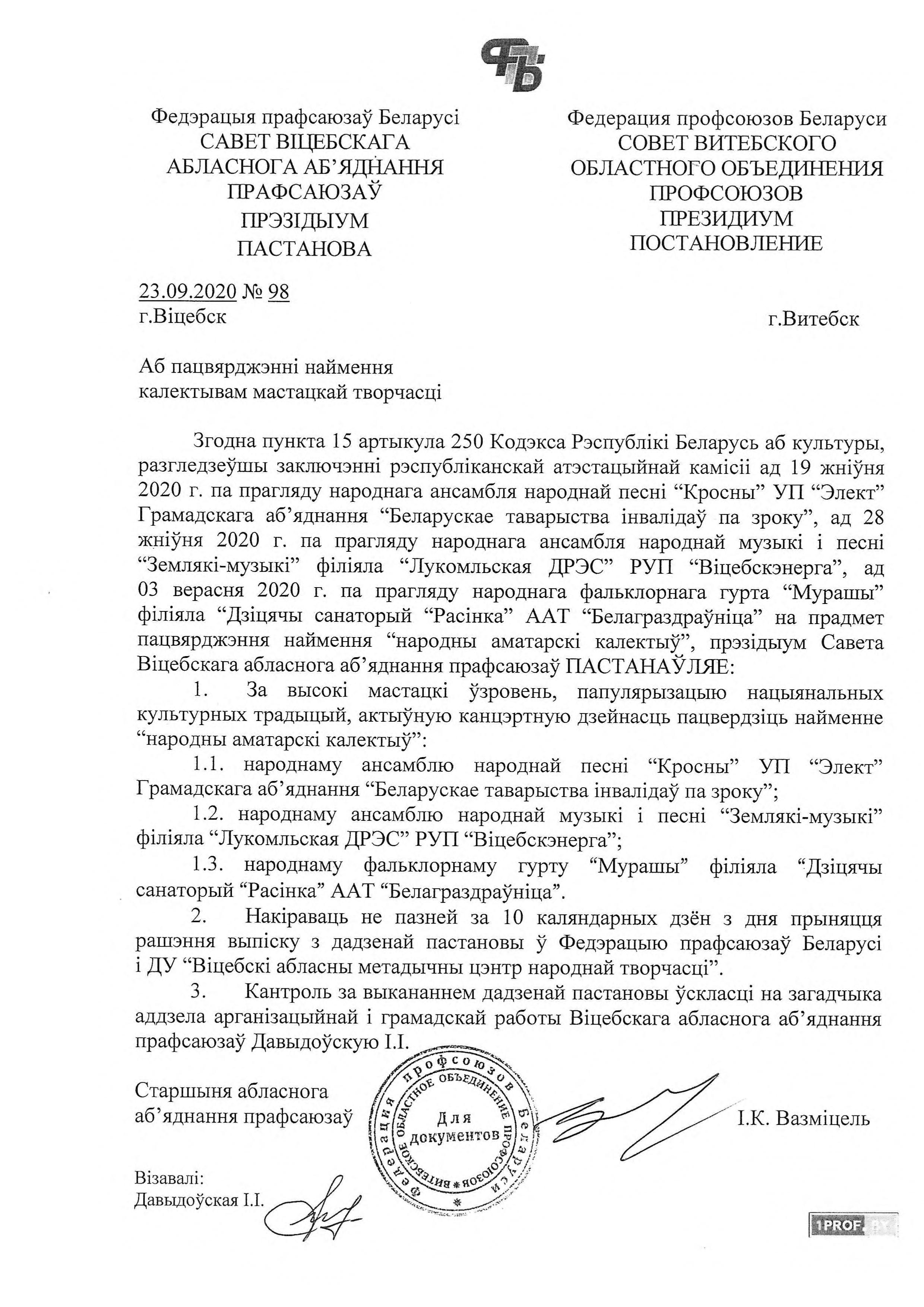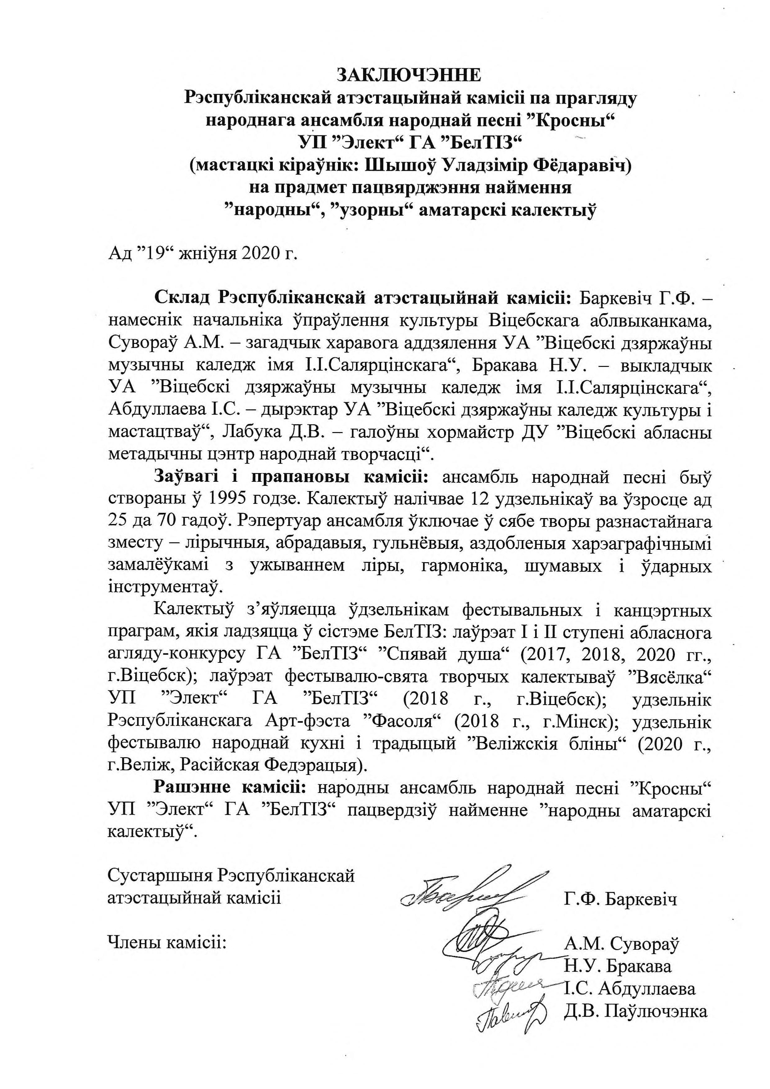 В сентябре 2020 года Народный ансамбль народной песни «Кросны» руководитель Владимир Федорович Шишов, Унитарного предприятия «Элект» ОО «БелТИЗ» в очередной раз подтвердил звание «народный».