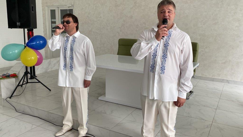 В этот торжественный момент всех присутствующих приветствовали своими музыкальными произведениями солисты народной мужской вокальной группы «Хорус» Юрий Ардынов и Дмитрий Шлома.