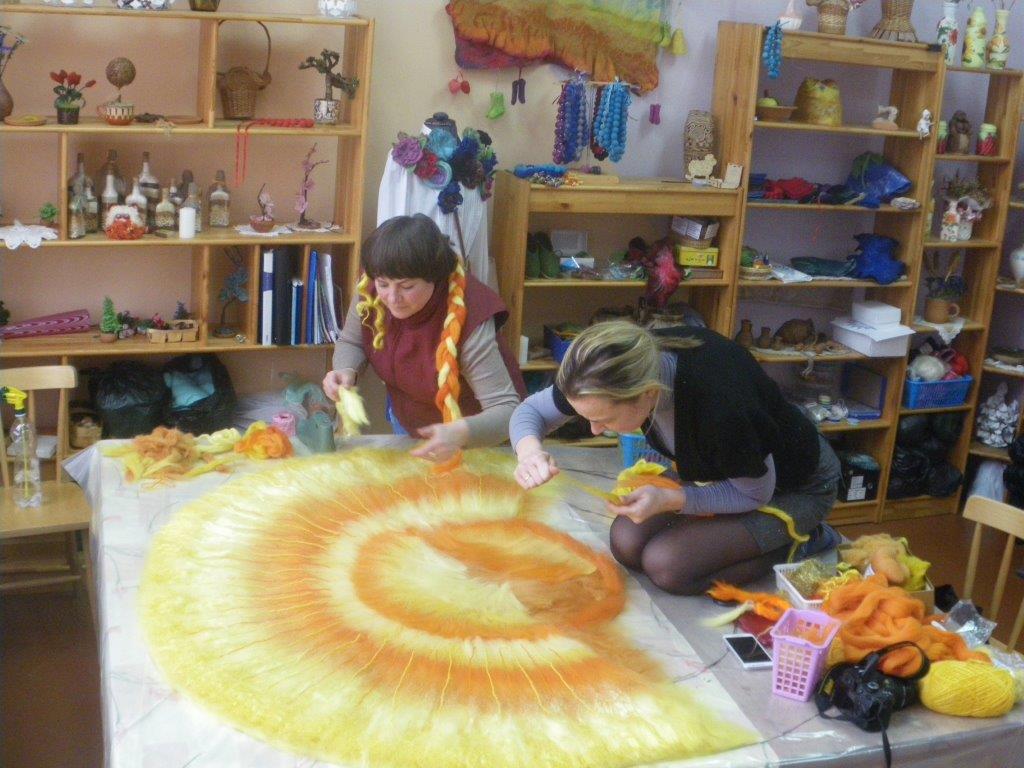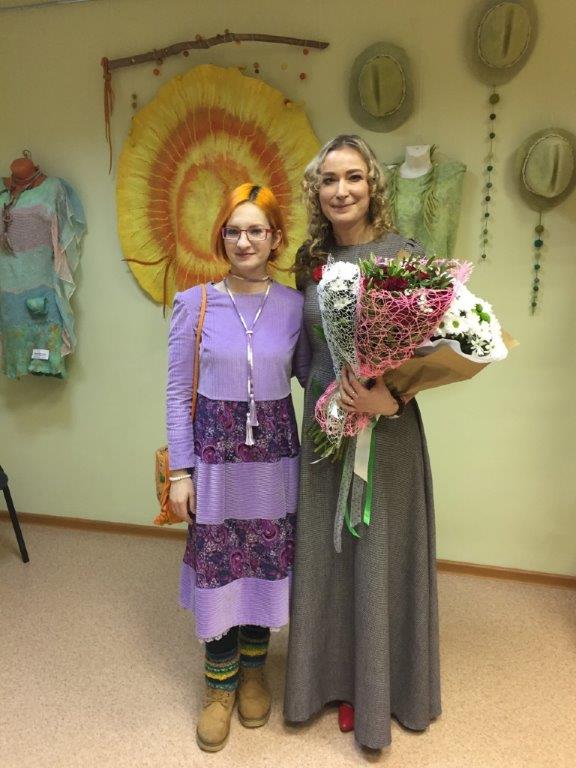 Ученица Юлии, работница унитарного предприятия «Элект» ОО «БелТИЗ» Елена Латышева сегодня уже сама работает вместе с ней в тандеме в технике мокрого валяния. Она также высказала слова благодарности подруге.