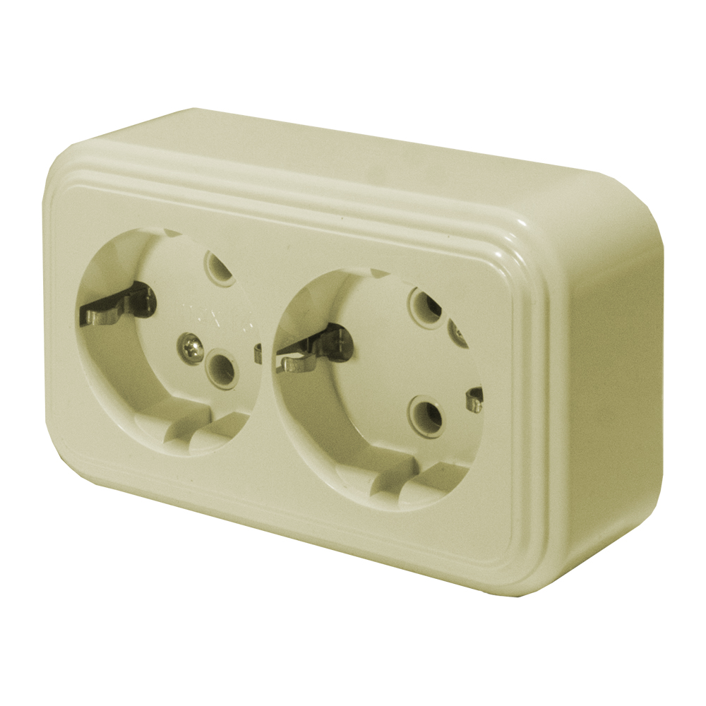 Двухместная розетка штепсельная двухполюсная открытой установки с заземляющим контактом предназначена для присоединения электрических приемников с номинальным напряжением 250 В к электрической сети переменного тока в нормальных климатических условиях внешней среды по ГОСТ 15150 и ГОСТ 15543.1.